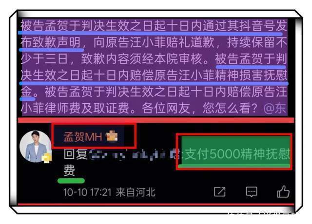 孟贺于判决生效之日起十日内通过某音平台账号发布致歉声明,并向汪小菲发致歉声明,内容须经本院审核。孟贺赔偿汪小菲精神损害抚慰金5000元,以及律师费及取证费。